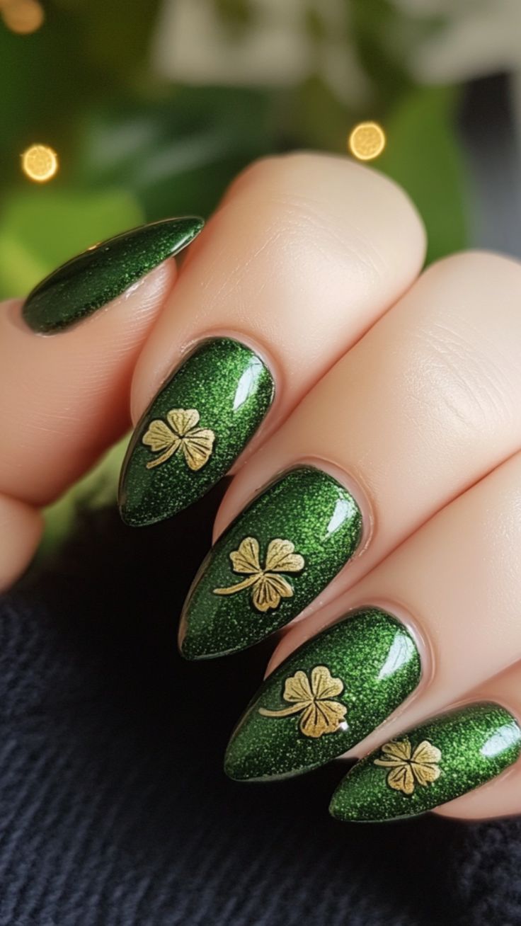 Metallic shades add a sleek and glamorous touch to your St. Patrick’s Day nails.
